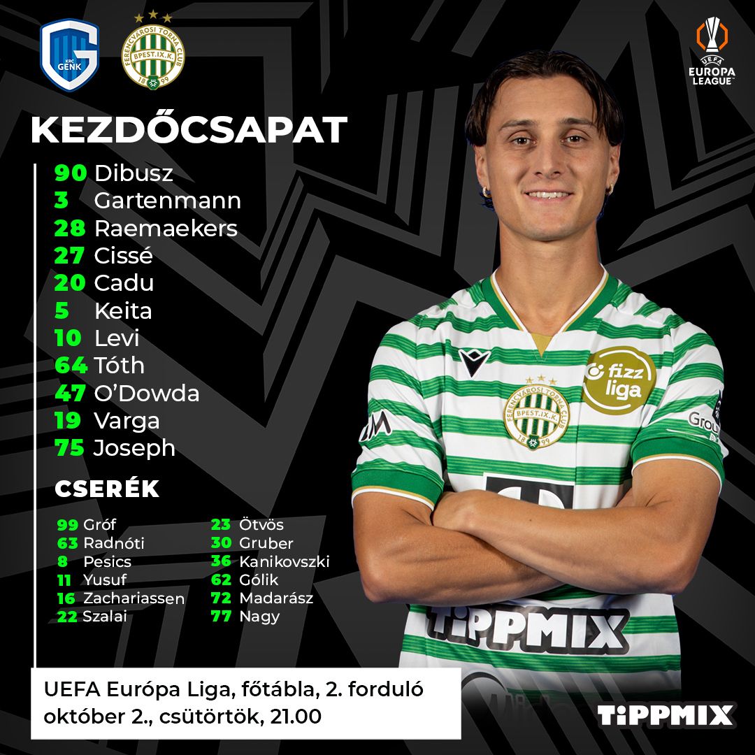 KRC Genk: Van Crombrugge – El-Uahdi, Sadick, Smets, Kayembe – Heynen, Hrosovsky, Bangoura – Dzsunja, Hjon Gju, Steuckers. Ferencváros: Dibusz – Gartenmann, Raemaekers, Cissé – Cadu, Tóth A., N. Keita, Levi, O’Dowda – Varga, Joseph.