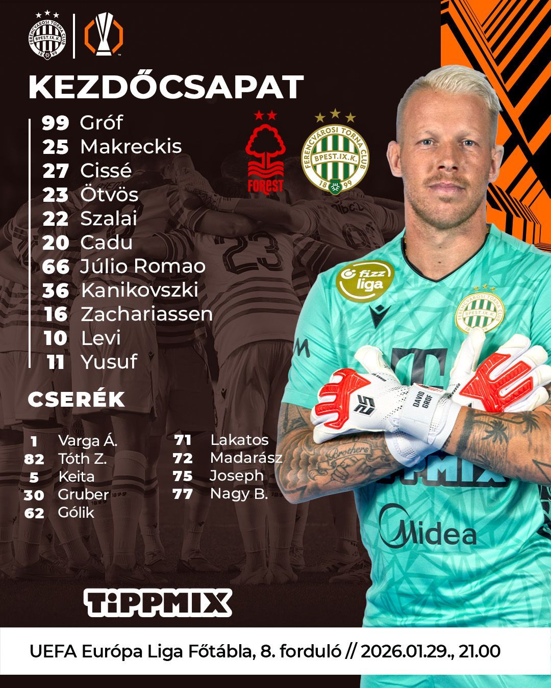 A hétvégi, Brentford elleni bajnokihoz képest öt helyen is változott a hazaiak összeállítása. Pedig azon a találkozón nyert a Forest, ami nagyon rá is fért, hiszen menekül a kiesés elől. Más azonban a hazai terep és más a nemzetközi, mert az Európa Ligában ugyanúgy biztosan továbbjutottak, mint a magyar bajnok, igaz, az azonnali nyolc közé jutásra nekik már nem volt esélyük egy mai győzelemmel sem.