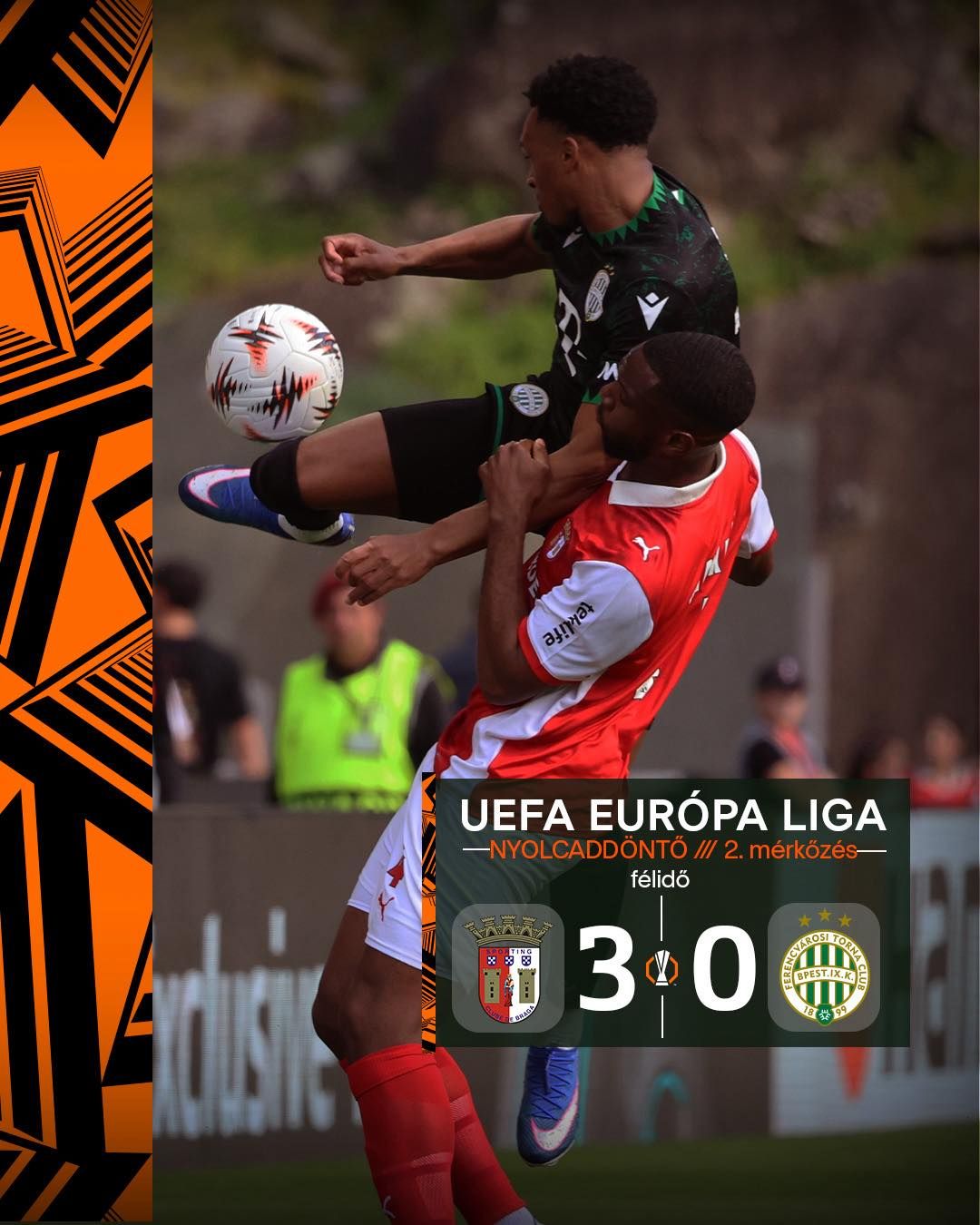 Ha a mérkőzés előtt még kérdéses volt is, hogy a Braga milyen felfogásban kezdi el a találkozót, ezek a kérdések hamar elszálltak. Az ezúttal piros mezben játszó hazai csapat azonnal nagy elánnal támadni kezdett, érezhető volt, hogy mielőbb faragni akartak az Üllői úton összeszedett hátrányukból. A 2. percben rögtön szögletet rúghattak, majd csakhamar két újabb helyzettel riogatták a mieink kapuját. A 11. percben aztán sajnos megszerezték a vezetést is. Zalazar futott el a jobb szélen, élesen középre lőtt labdájáról minden védőnk lemaradt, így a hosszún érkező Horta közelről a hálóba tessékelte a játékszert (1–0). Nagyon hamar megszületett az első hazai gól, amitől mintha még nagyobb lendületbe jött volna a Braga, mert továbbra is támadásban maradt, sőt… A 15. percben egy párharc után labdát szerzett a hazai együttes, Zalazar beadását Raemaekers még blokkolni tudta, a duplázó Grillitsch azonban 19 méterről a hálóba lőtt (2–0). Bár a labda Gróf hóna alatt jutott a kapuba, nem igazán hibáztatható érte a hálóőr, mert ha minimálisan is, de megpattant a lövés, ami miatt irányt változtatott a labda. A 23. percben a roppant aktív Zalazar átadása után ismét Horta próbálkozott, ezúttal egy löbböléssel, de Gróf nagy bravúrra kitornázta a labdát. A 25. percben veszélyeztetett először a magyar bajnok, Yusuf lövése azonban jócskán fölé szállt. Sajnos a Ferencváros nem sokat mutatott a Budapesten látott érett, fegyelmezett játékából. Hátul könnyedén zavarba hozható volt a védelem, az uruguay-i válogatott Zalazart nem tudták tartani Gómezék, a támadásaink pedig rendre elhaltak a portugálok védekezésén, így szinte teljesen veszélytelenek voltunk kapura. A 34. percben újabb gólt szerzett a Braga. Gabi Martinez lépett ki a leshatáron, egyedül törhetett kapura, és a büntetőterületen belülre érve higgadtan gurított a bal sarokba (3–0). A hátralévő percekben kicsit visszavett a lendületből a Braga, így kiegyenlítődött a játék, de helyzeteket így sem tudtunk kidolgozni, így a meccsen három, összesítésben pedig egygólos hátránnyal vonulhattunk pihenni és próbálni rendezni a sorokat.