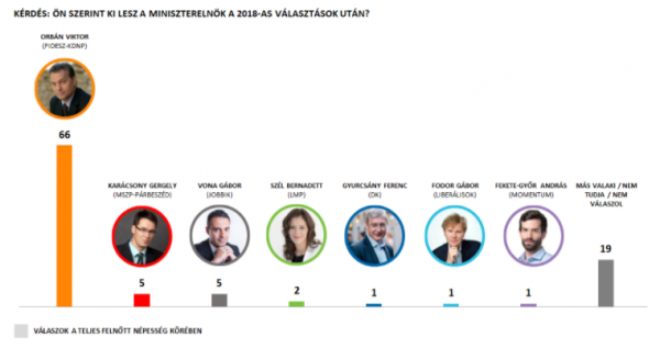 A felmérés arra is kitért, hogy a választók szerint ki lesz az április 8-i választás után a miniszterelnök. E tekintetben a teljes felnőtt népesség kétharmada (66 százalék) véli úgy, hogy Orbán Viktor marad a kormányfő a választás után. Ezen a bázison mindössze 5-5 százalék számít arra, hogy Karácsony Gergely vagy Vona Gábor lesz a miniszterelnök. Szél Bernadett kormányfőségére a teljes felnőtt népesség körében 2 százalék, míg Gyurcsány Ferencére, Fodor Gáboréra és Fekete-Győr Andráséra egyaránt 1 százalék számít.