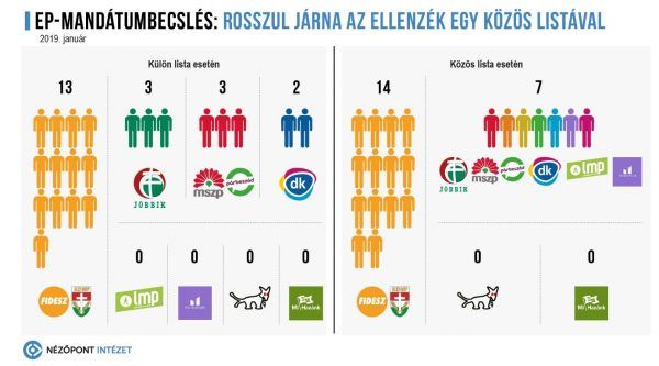 A Nézőpont Intézet adatai alapján a Fidesz-KDNP 54, a Jobbik 14, a baloldali pártok pedig összességében 26 százalékot szereznének abban az esetben, ha mindenki külön listát indítana. Közös listaállítás esetén azonban változna a helyzet, a Nézőpont Intézet telefonos közvélemény-kutatása szerint nagyobb a taszító, mint szimpatizánsokat vonzó hatása a napirenden lévő együttműködési stratégiának, ugyanis ebben az esetben a Fidesz-KDNP 60, a szivárványkoalíció pedig 33 százalékot érne el. Mindebből az következik, hogy a Fidesz-KDNP 13 helyett 14, az ellenzéki pártok – a Demokratikus Koalíciótól a Jobbikig – 8 helyett 7 mandátumot szereznének egy most vasárnap esedékes EP-választáson abban az esetben, ha a közös listaállítás mellett dönt az ellenzéki oldal.