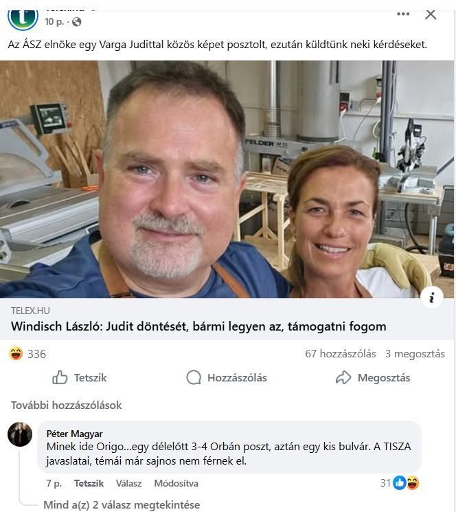 A balliberális hírportál a Facebookon is megosztotta az interjút. Alig volt kint 3 perce (!) az írás, Magyar Péter máris kommentelt: „Minek ide Origo… egy délelőtt 3-4 Orbán-poszt, aztán egy kis bulvár. A Tisza javaslatai, témái, már sajnos nem férnek el.”