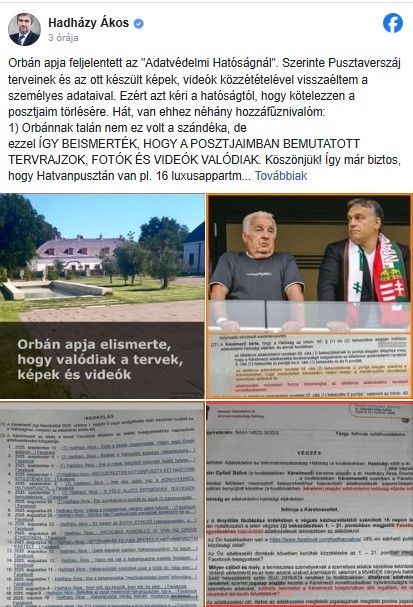 Orbán Győző azt kezdeményezte a Nemzeti Adatvédelmi és Információszabadság Hatóságnál, hogy az kötelezze az országgyűlési képviselőt korábbi posztjai törlésére - írta az Index. Hadházy szerint a kormányfő apja ezzel beismerte: Hatvanpusztán van például 16 luxusapartman, séflakás, pálinkafőző terasz, steak-előkészítő, 200 négyzetméteres ebédlő, dohányzószobák, kétmilliós kádak, öt lift, három hatalmas mélyhűtőkamra, satöbbi.