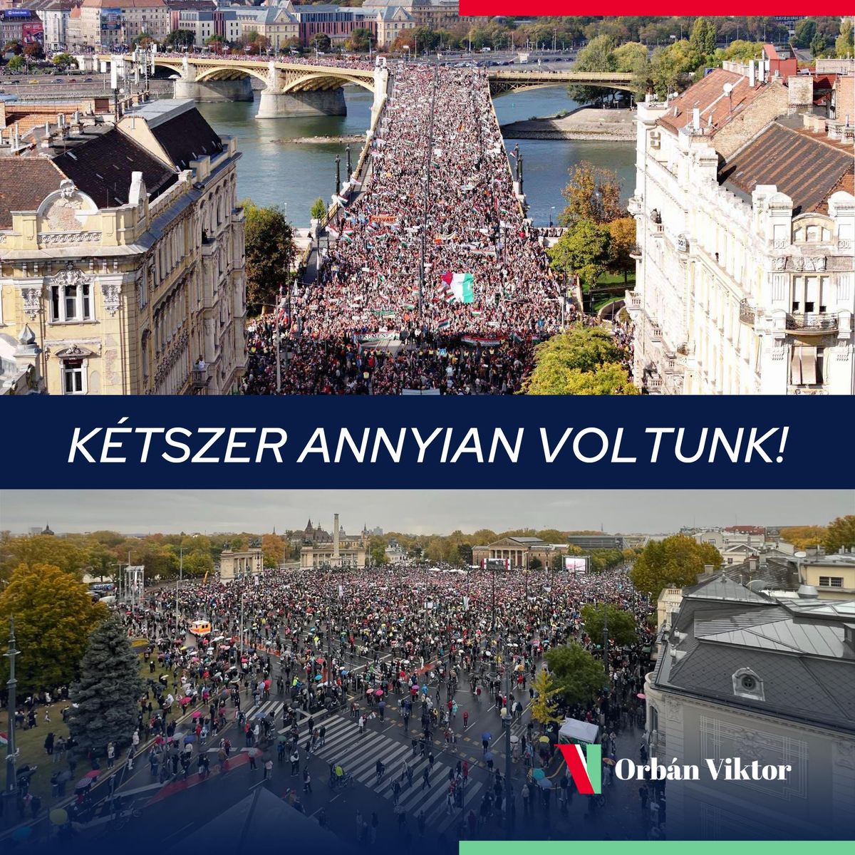 Még soha nem voltak ennyien Békemeneten, mint ma. Kétszer annyian voltunk a Békemeneten, mint a Tisza háborús menetén. Köszönjük! - írta Facebook oldalán Orbán Viktor miniszterelnök.