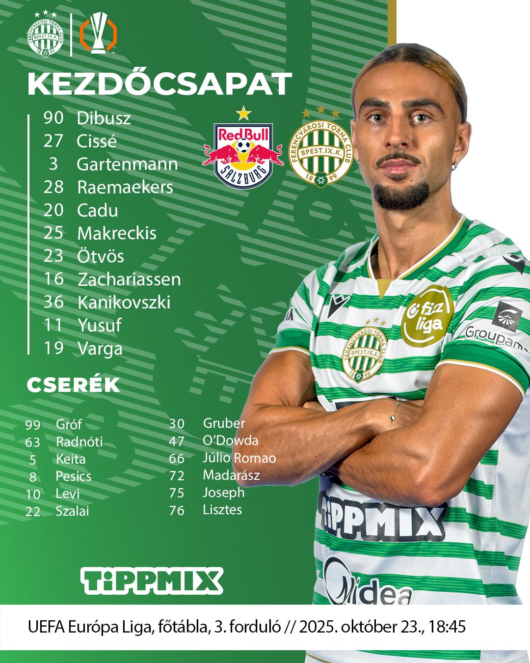 Salzburg: A. Schlager – Lainer, Gadou, J. Rasmussen, Krätzig – Yeo, Diabaté, Kjaergaard, Alajbegovic – Ratkov, Baidoo. Ferencváros: Dibusz – Gartenmann, Raemaekers, I. Cissé – Makreckis, Ötvös, Kanikovszki, Zachariassen, Cadu – Varga B., Yusuf.