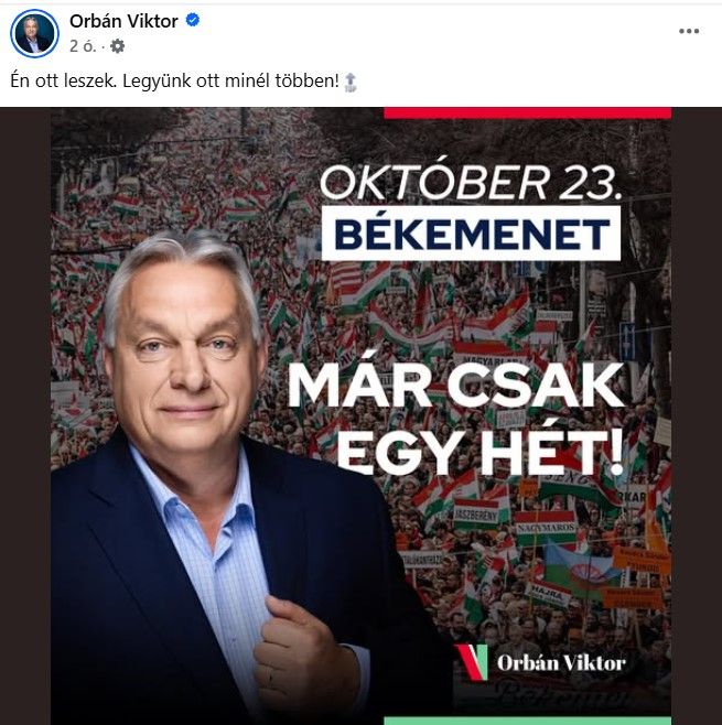 Az október 23-ra meghirdetett Békemeneten való részvételre buzdított csütörtöki Facebook-bejegyzésében Orbán Viktor. A miniszterelnök közölte, ő ott lesz az eseményen, és azt kérte: legyünk ott minél többen.