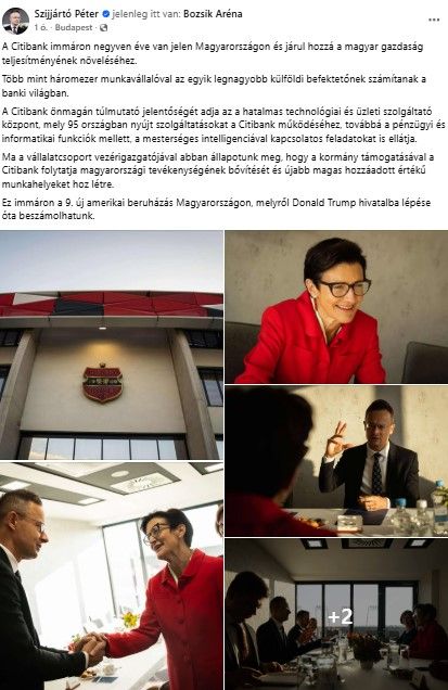 Megállapodás született arról, hogy a Citibank folytatja magyarországi tevékenységének bővítését, így ez immár a kilencedik amerikai beruházás Donald Trump elnök januári hivatalba lépése óta - írta Szijjártó Péter külgazdasági és külügyminiszter pénteken a Facebookon.