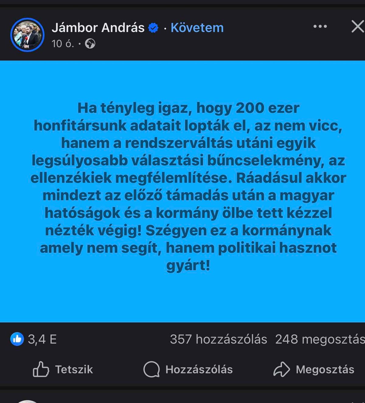 A botrány jól láthatóan többszörösen kínos Magyar Péteréknek, de ami még kellemetlenebb, hogy Jámbor András még ezt is megtoldotta eggyel. Először még ő is azt közli Facebook-bejegyzésében, hogy az adatlopás az egyik legsúlyosabb bűncselekmény, következő mondatában pedig egyenesen a kormány és a rendőrség felelősségét firtatja, mondván „ölbe tett kézzel nézte végig” a bűncselekmény elkövetését.