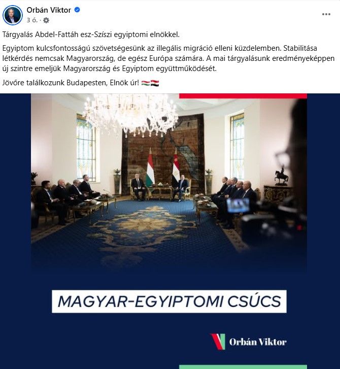 Az Abdel-Fattáh esz-Szíszi egyiptomi elnökkel szervezett találkozója után a közösségi médiában jelentkezett bejegyzésével Orbán Viktor. A miniszterelnök szerint Egyiptom kulcsfontosságú szövetségesünk az illegális migráció elleni küzdelemben.