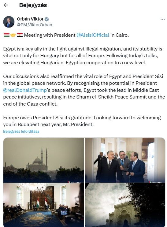 A miniszterelnök az X-en is közzétette egyiptomi látogatásának eredményeit, ott azt írta, hogy a megbeszéléseik megerősítették Egyiptom és Szíszi elnök szerepének jelentőségét a globális békehálózatban.