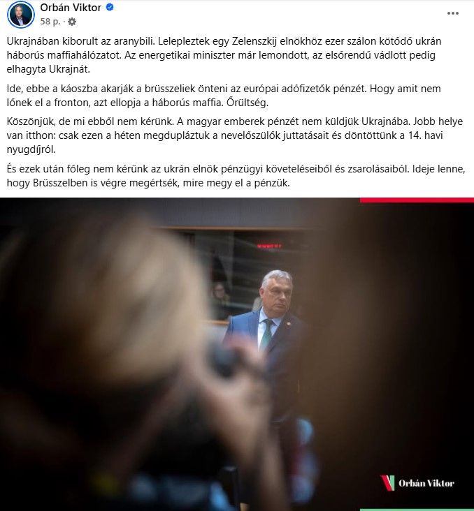 Ukrajnában kiborult az aranybili. Lelepleztek egy Zelenszkij elnökhöz ezer szálon kötődő ukrán háborús maffiahálózatot. Az energetikai miniszter már lemondott, az elsőrendű vádlott pedig elhagyta Ukrajnát – írta csütörtöki Facebook-bejegyzésében Orbán Viktor.