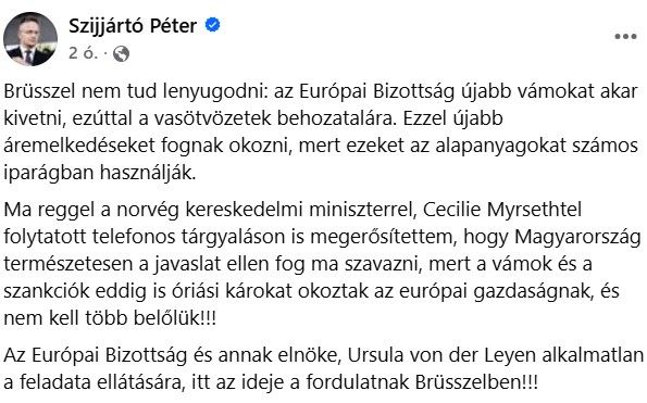 A minisztérium közleménye szerint a tárcavezető friss bejegyzésében sérelmezte, hogy Brüsszel nem tud lenyugodni, és kiemelte, hogy az Európai Bizottság újabb vámokat akar kivetni, ezúttal a vasötvözetek importjára, amivel csak további áremelkedéseket fognak okozni, mert ezeket az alapanyagokat számos iparágban használják.