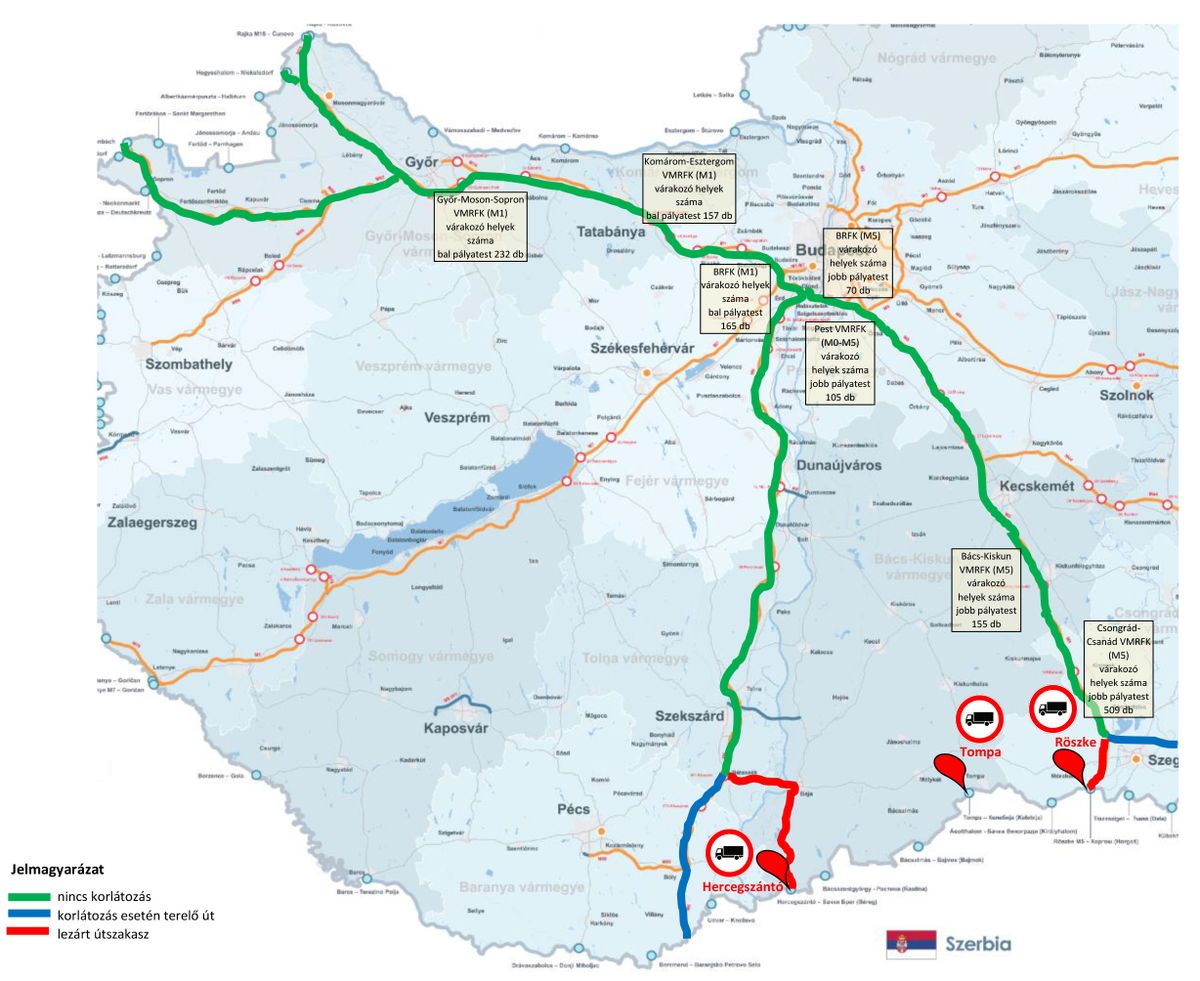 A magyar–szerb határszakaszon a következő teherforgalmi átkelőhelyek teljes lezárás alá kerülnek, belépő és kilépő irányban egyaránt: