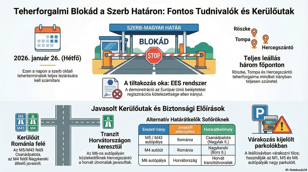 A magyar rendőrség figyelmezteti a szerb határhoz igyekvő a fuvarozókat és a közlekedőket; riasztás kamionblokád miatt. A Szerb, Bosznia-Hercegovina és Montenegró Fuvarozók Szövetségének tagjai 2026. január 26-án (hétfőn) 12:00 órától határozatlan ideig országos demonstrációt kezdenek a határokon, így a magyar-szerb határon is.