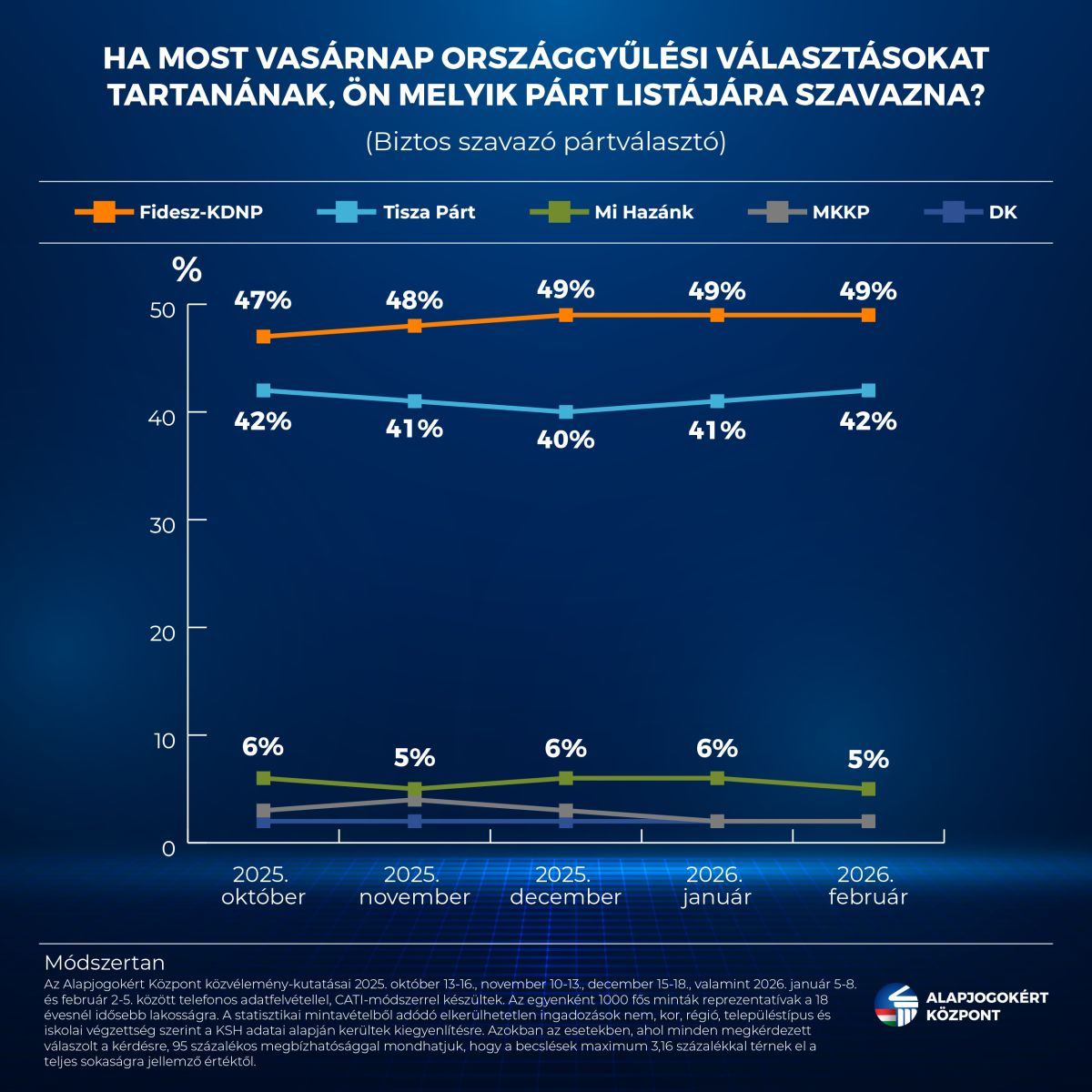 A Fidesz-KDNP országos listáját a biztos szavazó pártválasztók 49 százaléka támogatná egy most vasárnap esedékes választáson, míg a Tisza Pártra 42 százalékuk voksolna – derül ki az Alapjogokért Központ közvélemény-kutatásából.