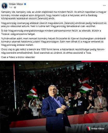 Kampány ide, kampány oda, az ukrán olajblokád ma mindent felülír. Az elmúlt napokban a magyar kormány minden erejével azon dolgozott, hogy kezelni tudjuk a helyzetet, amit a Barátság kőolajvezeték lezárásával okozott Zelenszkij elnök – írta hétfői Facebook-bejegyzésében Orbán Viktor miniszterelnök.