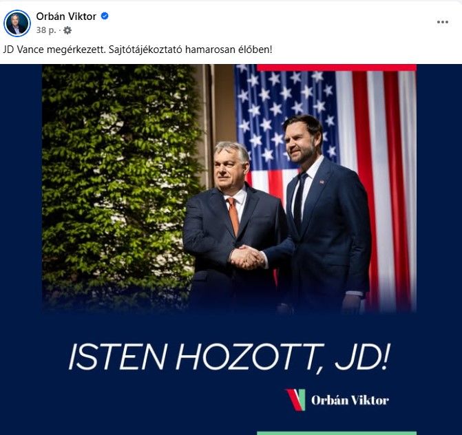 JD Vance megérkezett. Sajtótájékoztató hamarosan élőben! - közölte keddi Facebook-bejegyzésében Orbán Viktor miniszterelnök, aki hivatalában, a Karmelita kolostorban fogadta az Amerikai Egyesült Államok alelnökét.