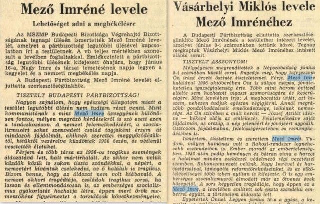 „Nagy Imre újratemetésének előkészítésére a Népszabadság június 8-i száma címoldalon közölte a Köztársaság téri összecsapásban meghalt Mező Imre özvegyének megbékélésre szólító levelét: >Férjem és több társa az 1956-os tragikus események áldozatává lett, halt mártírhalált. Az akkor nem velük küzdők közül is sokan tiszta szándékokkal, a népért, a nemzetért kívántak cselekedni, az ő haláluk is tragikus… Egyetértek mindazokkal, akik június 16-át, Nagy Imre és sorstársai temetésének napját a gyász, a megemlékezés és ezáltal a nemzeti megbékélés napjaként kívánják megélni.
