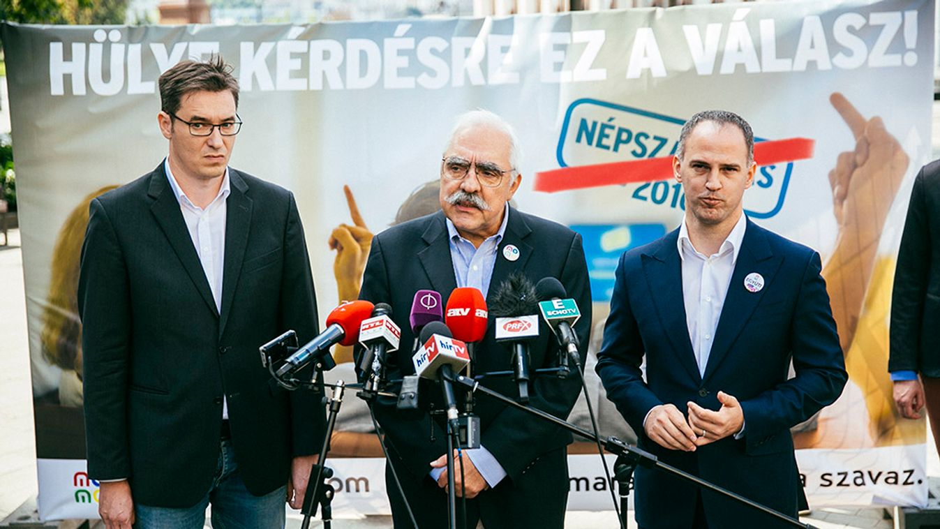 Közösen szólít bojkottra az októberi kvótareferendummal kapcsolatban az Együtt, a Párbeszéd Magyarországért és a Modern Magyarország Mozgalom (MoMa). A baloldali törpepártok vezetői, Szigetvári Viktor, Karácsony Gergely és Bokros Lajos ma Budapesten leplezték le közös óriásplakátjukat, amely a következő napokban az ország több pontján is megjelenik majd és amelynek felső részén a „Hülye kérdésre ez a válasz!” felirat olvasható, alatta pedig egy háttal ülő nő és férfi mutat be középső ujjával. A plakáton emellett az "Aki otthon marad, Európára szavaz" és egy vörössel áthúzott "Népszavazás 2016" felirat, valamint a három párt logója szerepel.