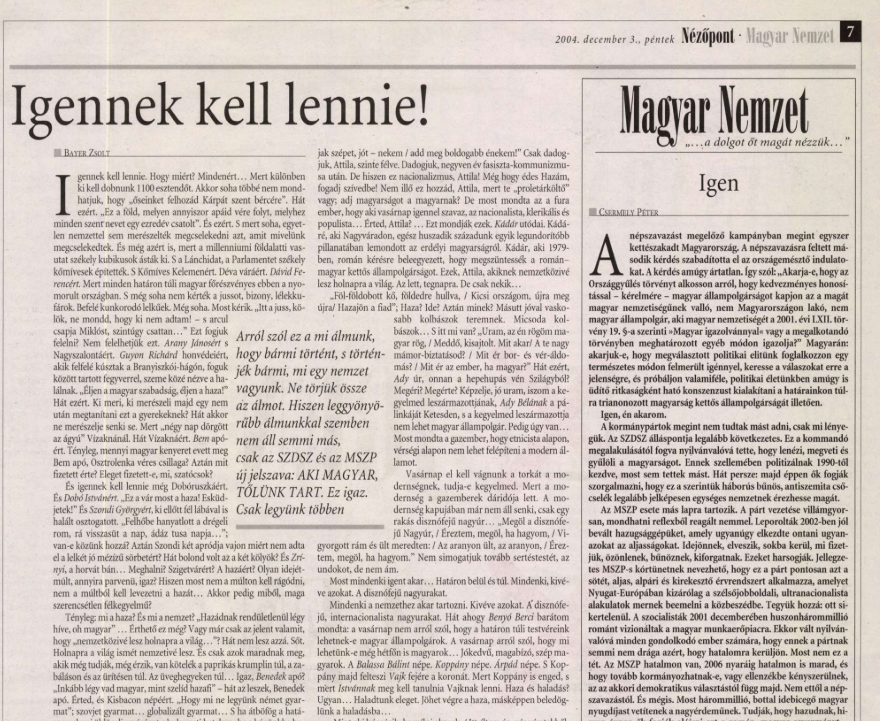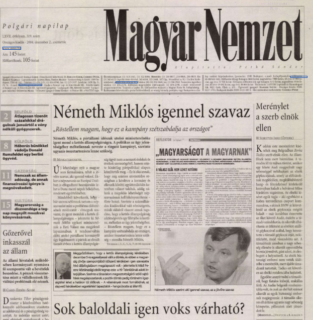 Igenre buzdít a Magyar Nemzet a 2004. december 5-i népszavazás előtt.