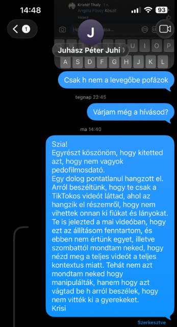 Többek között újra pedofíliáról beszélt, és ebbe portálunkat is bevonta. Juhász ugyanis azt állította, hogy beszélt Thaly Kristóffal, akinek olyan üzeneteket adott a szájába, amit Thaly egyáltalán nem mondott. Juhász Hírhamisító Péter ugyanis azt hazudta, hogy Thaly elismerte neki, hogy Huth Gergely főszerkesztő manipulálta a vele készített interjúról készült felvételt. Így a PestiSrácok.hu főszerkesztője megkereste Thaly Kristófot, aki megerősítette, hogy semmi ilyesmit nem mondott Juhásznak, amit fel is rótt neki a videó kikerülését követően, hogy ezeket a hazugságokat helyreigazítsa a hírhamisító. Juhász eddig ezt nem tette meg. Alább látható Thaly Kristóf üzenete Juhásznak