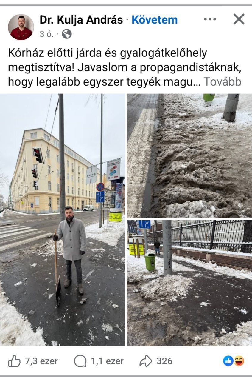 Mivel a hólapátolás szexi, ezért most minden valamirevaló közszereplő beállt a sorba és posztolt egyet meló közben. Nincs ezzel semmi baj, csak tényleg csinálják, ne csak a fotó kedvéért álljanak ki az utcára. Úgy, mint Kulja András, aki saját bevallása szerint egymaga eltakarította az összes havat az Astoriától a Corvin negyedig, mindezt úgy, hogy előtte még a Klinikáknál is ő volt az egyetlen szorgos kéz: