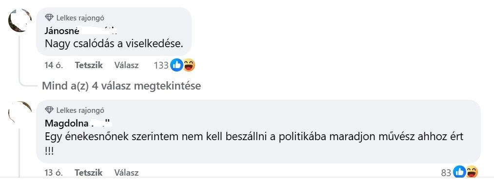 A kommentek között aztán felbukkant egy rajongó, aki nem csak csalódott, de meg is döbbent azon, hogy az énekesnő ennyire nem lát át a szitán, nem félti a nemrég született gyermekét attól a jövőtől, amit a Tisza elhozhat.