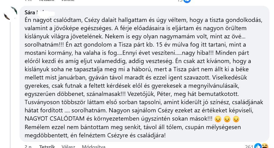Írja Csézynek az egyik rajongója, akinek soraiból kivehető, hogy nem örül annak, hogy kedvenc énekesnője politizál, mégpedig a másik oldalon. A következő azt írja, hogy simán csak csalódott, de az utána következőnek már az a véleménye, hogy egy énekesnő nem szálljon be a politikába.