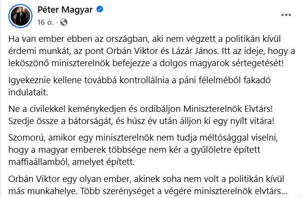 Az az elmezavarodott pióca, aki úgy vár több szerénységet a jelenleg ötödik ciklusát töltő kormányfőtől, hogy ő maga senki iránt nem tanúsít tiszteletet, nemhogy szeretetet. Aki újságírókon élcelődik és megpróbálja megalázni őket. Aki leszámolást emleget mindenkivel szemben, aki nem a Tisza Párt szekerét tolja, aki már most televíziós társaságok bezárásával fenyegetőzik, mert azok nem úgy bánnak vele (értsd. mernek kérdezni), ahogy ő azt elképzelte. Aki szerint ő maga az a „messiás”, akire az egész ország várt, akik pedig nem, azok vagy elfogadják őt vagy földönfutókká válnak.