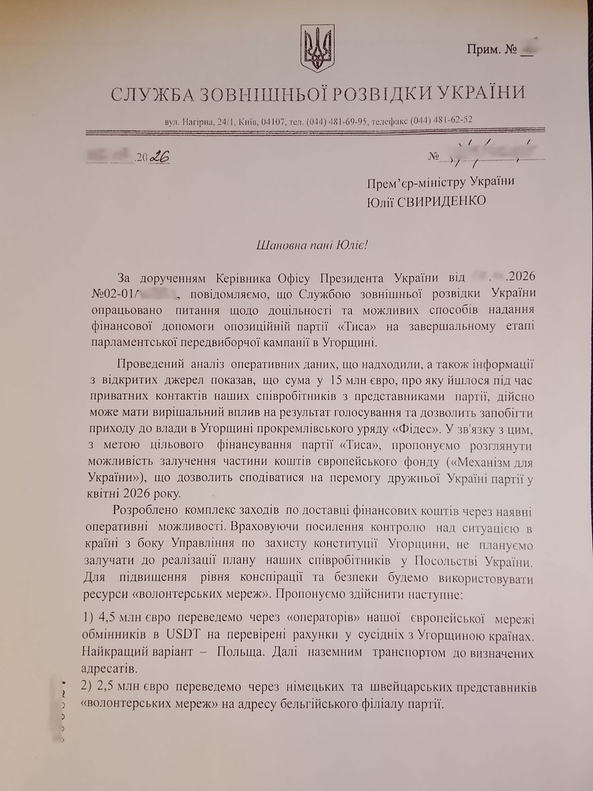 Egy ismeretlen címről érkezett szerkesztőségünkbe az a levél, melyet Ukrajna Külföldi Hírszerző Szolgálatának vezetője, Oleg Lugovszkij küldött egy bizonyos "Júliának", amelyben arról írnak, megvizsgálták a lehetőségét a Tisza Párt támogatásának a közelgő választáson, erre külön anyagi forrásokat is elkülönítettek, valamint javasolják, hogy az uniós Ukrajna Mechanizmus néven nyitott pénzügyi alap egy részét is felhasználják: