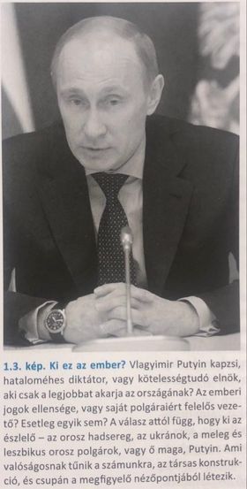Megjelenik a tankönyvben a liberális képzeletvilág egyik politikai főgonosza Vladimir Putin orosz elnök is, akit provokatív jelzőkkel állítanak pellengérre a szerzők. Ő a kapzsi, hataloméhes diktátor, az emberi jogok ellensége. Szinte lehet érezni, hogy a fordító milyen szívesen cserélte volna Putyint Orbán Viktorra, de a jogtulajdonos sajnos nem engedte.