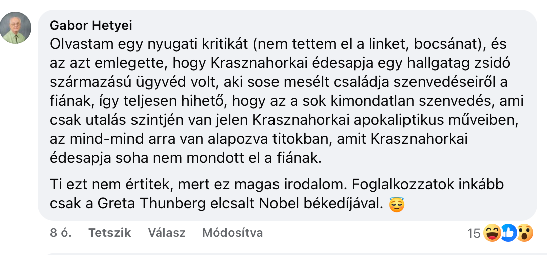 Olvastam egy nyugati kritikát (nem tettem el a linket, bocsánat), és az azt emlegette, hogy Krasznahorkai édesapja egy hallgatag zsidó származású ügyvéd volt, aki sose mesélt családja szenvedéseiről a fiának, így teljesen hihető, hogy az a sok kimondatlan szenvedés, ami csak utalás szintjén van jelen Krasznahorkai apokaliptikus műveiben, az mind-mind arra van alapozva titokban, amit Krasznahorkai édesapja soha nem mondott el a fiának. Ti ezt nem értitek, mert ez magas irodalom. Foglalkozzatok inkább csak a Greta Thunberg elcsalt Nobel békedíjával.