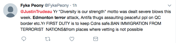 @JustinTrudeau. A “változatosság az erőnk” mottód elég sok ütést kapott ezen a héten. Edmontoni terrortámadás, antifa csőcselék, akik békés embereket támadnak meg Quebec határában…stb. AZ ELSŐDLEGES KÖTELESSÉGED, hogy védd meg a kanadai embereket. TILTSD BE A MIGRÁCIÓT A TERRORISTA ORSZÁGOKBÓL és az olyan helyekről, ahol az átvilágítás nem lehetséges.