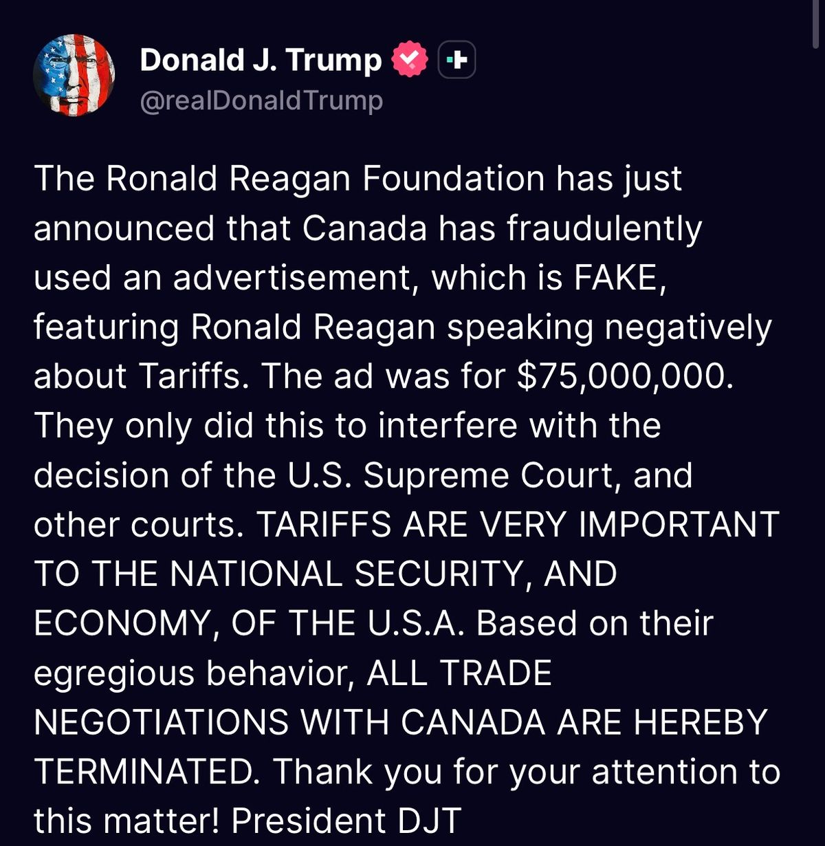 A hirdetésben Ronald Reagan korábbi republikánus elnök beszélt a vámokról, és arról, hogy azok „kereskedelmi háborúkat és gazdasági katasztrófákat” okoznak. Trump szerint azonban a videó kiragadott részleteket tartalmazott, és szándékosan ferdítette el Reagan üzenetét.
