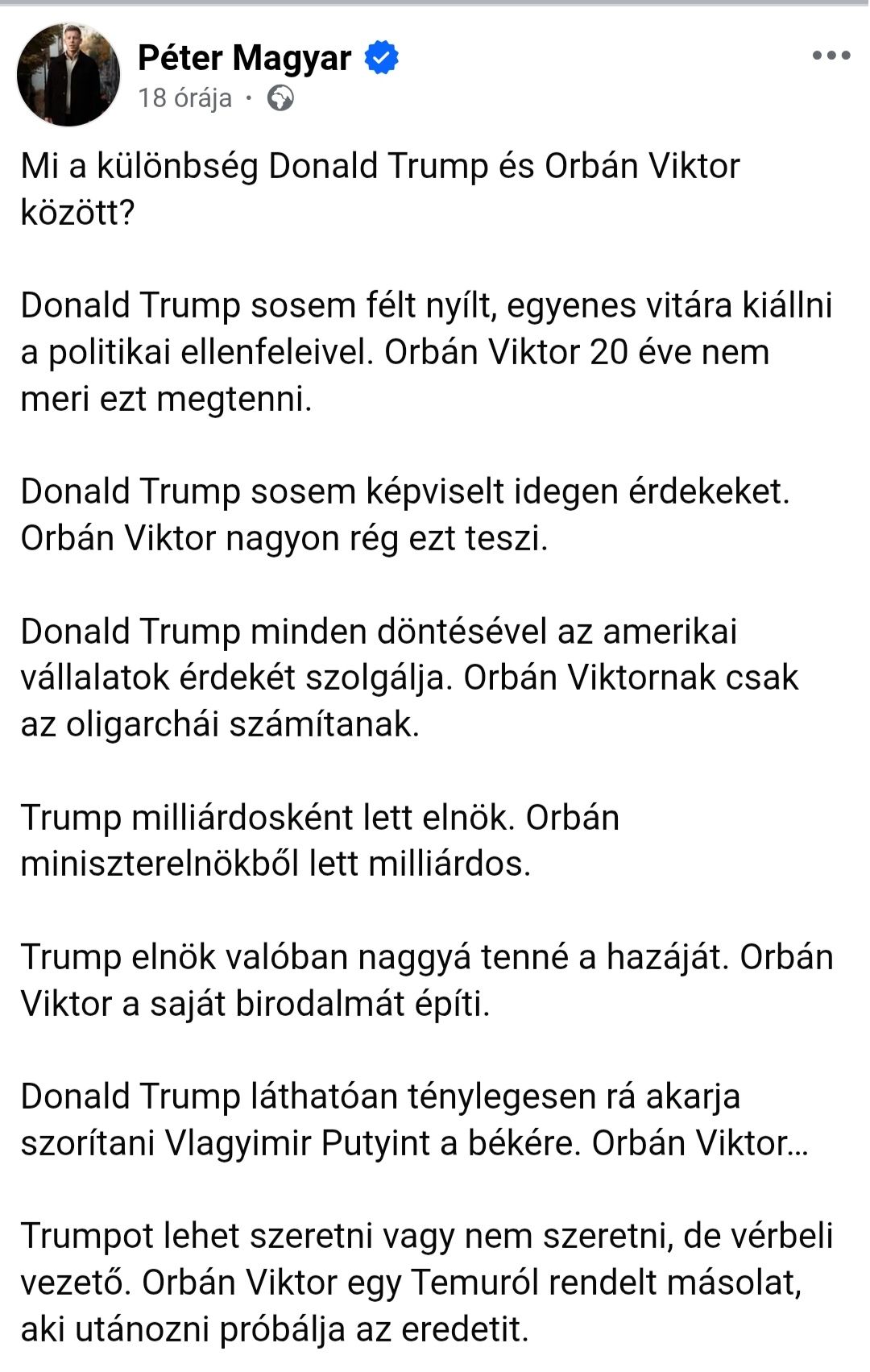Természetesen kihagyhatatlan a korábban Tusványoson és a Várkert Bazárban tartott országértékelők alkalmával rendre az első sorban mosolyogva tapsoló Magyar Péter is. Paradox módon neki a lehető legjobban jött Orbán washingtoni útja, hiszen ez elvitte a fókuszt arról a gyalázatról, hogy Tisza Párt kétszázezer támogatójának adatai kerültek nyilvánosságra a minap. Mivel a saját alkalmatlanságukat az oroszokra és közvetetten Putyinra hárította, így most nem tehette meg, hogy az amerikai elnökbe is belerúg. Igen ám, de akkor mi a megoldás? Hát az, hogy tövig benyalunk Trumpnak, aki mellett Orbán Viktort „Temuról rendelt utánzatnak” nevezzük. Elképesztő a nívótlanság mértéke. Különösen akkor, ha felidézzük, hogy Magyar Péter „ellen-Tusványost” hirdetett, vagy belegondolunk, hogy „véletlenül” éppen oda hirdetett országjárást, ahol Orbán Viktor is megjelenik majd a közeljövőben. Ezek után azzal vádolni valakit, hogy „Temuról rendelt utánzat”, hát… Finoman fogalmazva is megmosolyogtató. S persze felmerül a kérdés, hogy vajon nem lesz ebből "baja" Brüsszelben, ahol finoman fogalmazva is hűvös távolságtartással tekintenek az amerikai elnökre?