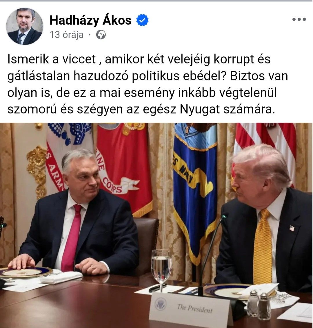A tüntikéző Hadházy Ákos legyen az első. Facebook-bejegyzésében tömény irigységgel imígyen fröcsög Orbán Viktor és Donald Trump közös fotóját kommentálva: „Ismerik a viccet, amikor két velejéig korrupt és gátlástalan hazudozó politikus ebédel? Biztos van olyan is, de ez a mai esemény inkább végtelenül szomorú és szégyen az egész Nyugat számára.” Bár elég sok viccet ismerek, korrupt politikusok ebédjéről szóló hamarjában nem jut eszembe, bármennyire töröm is rajta a fejem… Alighanem a hatvanpusztai zebrákról szóló mellébeszélései keverhették meg Hadházyt, hiszen az ezzel kapcsolatos állításait mosolyogva zúzta porrá egy barátságos arcú, idős néni a Békemeneten adott interjújával…