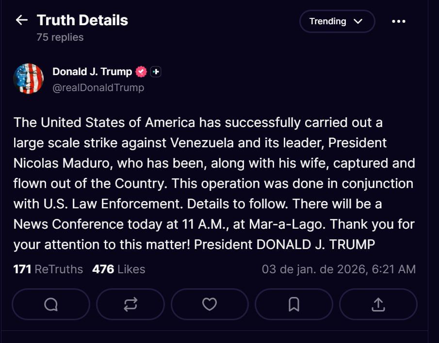 Donald Trump saját közösségi oldalán kommentálta az eseményeket. Az amerikai elnök bejelentése szerint az akció kifejezetten sikeresnek mondható, hiszen pár órával a támadás után elfogták Nicolas Madurót és feleségét, akiket az USA-ba szállítanak. Trump továbbá azt is bejelentette, hogy hamarosan sajtótájékoztatót tartanak az eseményekről.