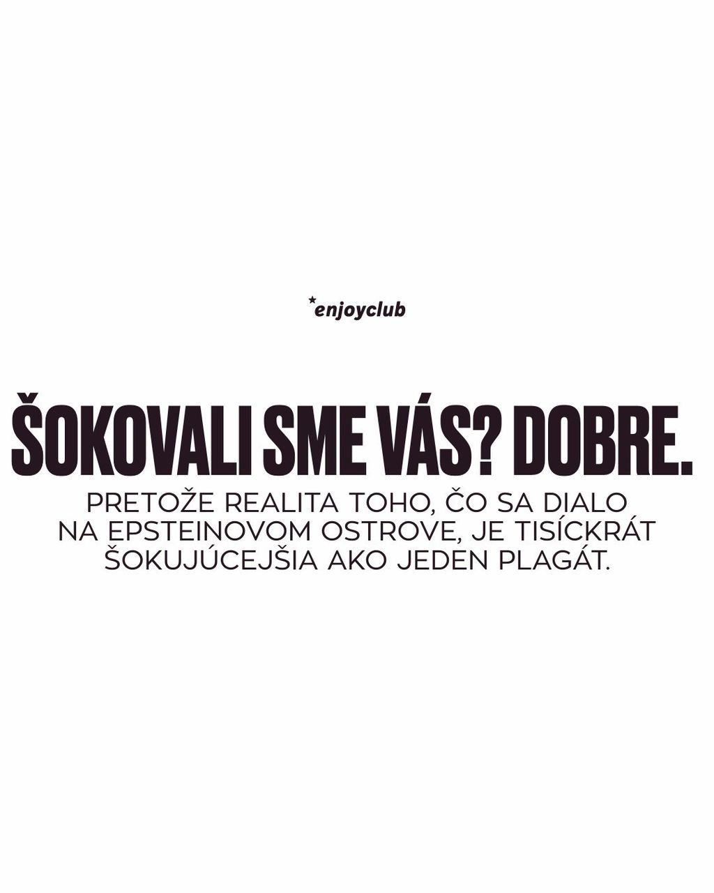 Botránytól hangos a szlovákiai sajtó; Epstein neve halálában is mérgező. Elképesztő, hogy az EnjoyClub közösségi oldalain olyan posztok jelentek meg, amelyek Epstein nevét viselő partit hirdettek, meztelen nőket ábrázoló képekkel és szövegekkel, amelyek átlépték az etika határait. A klub ingyen alkoholt ígért fiatal lányoknak, és azt sugallta, hogy 15 éves kortól érkezhetnek a résztvevők, a fiatalabbak pedig "idősebb nővér" kíséretében. Egy posztban még azt is írták, hogy lájkolással "helyet nyerhetnek Epstein szigetén".